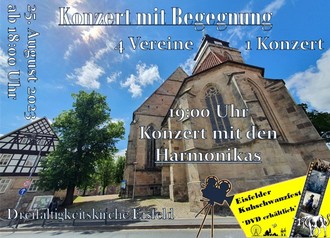Freuen Sie sich mit einem Konzert ab 19:00 Uhr auf den imposanten Klang des Orchesters der Harmonikas in der schönen Eisfelder Dreifaltigkeitskirche sowie anschließend zünftige Unterhaltung mit den Ständlas auf dem Kirchplatz.
