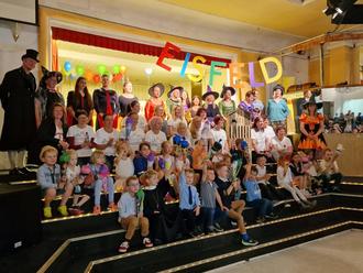 Plötzlich erschien ein „erwachsener“ Otto Ludwig. Er erzählte eine lange Geschichte über das „Zauberland Eisfeld“ und dessen Kindergarten „Kleine Weltentdecker“. Darin kamen alle Bald-Schulkinder und deren magischen Fähigkeiten vor. Gespannt lauschten wir alle der Erzählung, als Nebel über die Bühne wehte und Hexen mit ihren Besen die Bühne stürmten. Sie führten einen ausgelassenen Hexentanz auf und holten die Schulanfänger auf die Bühne. Aus einem Hexenkessel beschworen die mit den Hexen angereisten Zauberer die Schultüten herbei. Eine für jedes Wackelzahnkind.