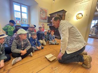 Herr Haine empfing uns im Eingangsbereich des Turmes, denn wir wollten heute hoch hinaus. Im Turmzimmer angekommen, machten wir es uns auf den Decken bequem.