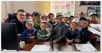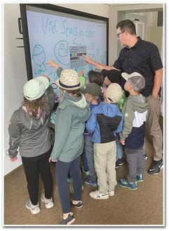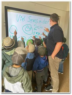 Im Saal des Rathauses stärkten wir uns erst einmal und wir erzählten von den Erlebnissen im Schloss. Herr Bauer zeigte den Vorschülern sein Büro mit dem großen Schreibtisch und dem interessanten ViewBord Monitor. Jeder durfte etwas malen und seinen Namen auf diese interaktive Tafel schreiben. Das war natürlich für uns eine große Ehre und bereitete viel Freude.