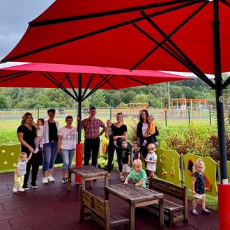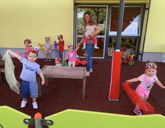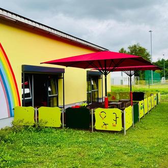Abschließend zum Thema schauten wir einen Film mit unserer Biene Maja und verspeisten ein Honigbrot. Gemeinsam mit der Biene flogen wir als Marienkäfer verkleidet noch einmal eine Runde über unsere neue Terrasse. Hier hat uns der Bauhof einen neuen Zaun, bestehend aus Motorikspielen, Tafeln und kleinen Spielereien gebaut. Passend dazu bekamen wir noch zwei neue Sonnenschirme.