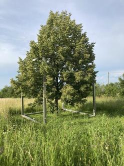Der aus 10 cm x 10 cm Edelstahl-Profil bestehende Würfel umgibt wie eine kostbare Fassung einen freistehenden Baum. In ihren Grundformen, so die Absicht des Künstlers, besitzen weder Baum noch Würfel einen besonderen visuellen Reiz. Erst durch das Zusammenfügen beider entsteht eine neue Spannung.