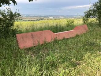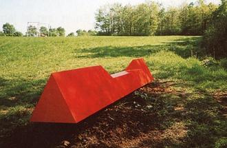 Eingebettet in den Wiesenrand scheint die rote, aus Indusriestahl geschweißte Plastik durch ihre Form der Landwirtschaft zugehörig und erweist sich dennoch als eine Kunstform. Den Vorübergehenden bietet sie sich zum Sitzen und Verweilen an.