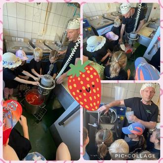 Nach einer kleinen Einführung bekam jedes Kind ein T-Shirt mit der Aufschrift „Ich habe Eis gemacht“. Nun ging es direkt in die Küche und wir durften alle gemeinsam Erdbeereis herstellen. Zuerst haben wir die frischen Erdbeeren geschnitten und danach ging es für uns auch schon ins „Eislabor“. Hier stand schon ein großer, vorbereiteter Topf mit Erdbeeren und natürlichen Rohstoffen wie Zucker, Glukose, ein wenig Salz… bereit. Auch unsere Erdbeere durften wir hinzufügen und haben anschließend eine Kostprobe der verschiedenen Zutaten bekommen.