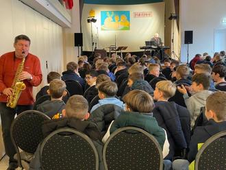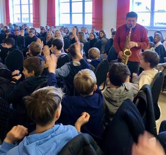Die Klassen 5 und 6 begegneten den Fabeln ganz neu. Das Publikum wurde immer wieder aktiv einbezogen, durfte mitdenken, lachen und staunen - und so entstand eine Atmosphäre, die sowohl lehrreich als auch inspirierend war. Besonders beeindruckend waren das Doppel-Flöten-Spiel von Christian Georgi oder die eindrucksvollen Rezitationen des Duos. Für die Klassen 7 und 8 standen die großen Balladen im Mittelpunkt. Durch stimmungsvolle Musik wurde deutlich, warum diese Texte bis heute fesseln und berühren. Die Klassen 9 und 10 tauchten schließlich in die poetische Welt Heinrich Heines ein. Zwischen feiner Ironie, Melancholie und musikalischer Sensibilität entstand ein intensives Zusammenspiel von Wort und Klang, das unter die Haut ging.