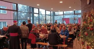 In diesem Jahr hatten wir nach Corona wieder eine sehr berührende Weihnachtsfeier mit 160 Gästen. Schüler:innen packten für alle ein Weihnachtspäckchen, eine Großbäckerei spendete den Kuchen, Student:innen spielten Weihnachtsmusik und der Bischof Heiner Koch war zu Gast. Das Beispiel zeigt, wie bunt das Leben in der Suppenküche ist und dass es ein Treffpunkt verschiedenster Gruppen ist, ja einfach mehr als „nur Suppe“.