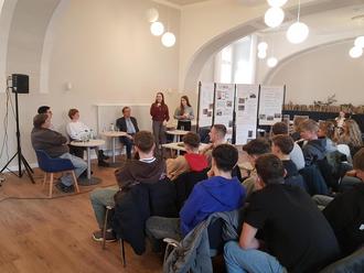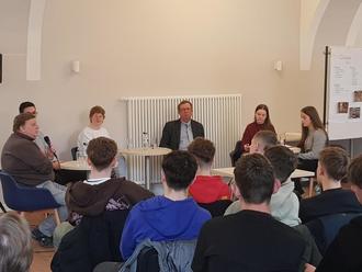 Der zweite Teil des Tages stellte ein Highlight dar: ein Podiumsgespräch mit geladenen Gästen aus verschiedenen Bereichen. Zu den Gästen gehörten der ehemalige langjährige Landrat des Eichsfeldes Dr. Werner Henning, Kaplan Lukas Hennecke aus Leinefelde, Gerald Nolte von der Caritas Leinefelde sowie Frau Katharina Pätzold, Dekanatsjugendseelsorgerin im Bistum Erfurt und Mitglied bei Bündnis 90/Die Grünen. Moderiert wurde das Gespräch von Sophia Döring und Stella Martin aus der Klasse 10b, die sich im Vorfeld sehr akribisch auf die Veranstaltung vorbereitet hatten.