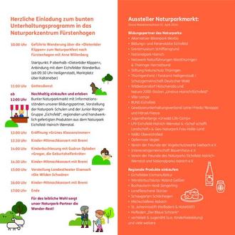 Der große Naturparkmarkt auf dem Erlebnisgelände lädt ab 12:00 Uhr zum Besuch ein. Zahlreiche Stände bilden die Vielfalt der Region ab, informieren über die Natur- und Kulturlandschaft und laden zum Kauf von nachhaltigen und regionalen Produkten ein.