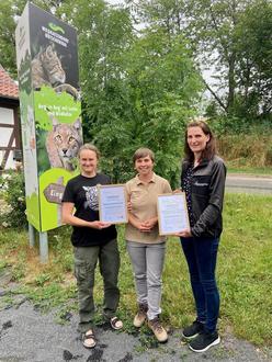 "Dr. Katrin Vogel (l.) vom Wildkatzendorf Hütscheroda und Diana Ludwig (r.) vom Baumkronenpfad erhielten ihre "Leuchtturm-Auszeichnung" von Naturparkleiterin Claudia Wilhelm (Mitte)"