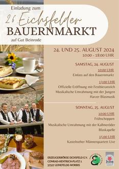 Am 24. und 25. August 2024 findet der Eichsfelder Bauernmarkt statt. Zum 26. Mal laden die Erzeugerbörse und der HVE Eichsfeld Touristik e.V. auf das kulinarische Event ein.
