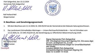 Die Satzung tritt am 01. Januar 2025 in Kraft. Gleichzeitig tritt die Festsetzung der Hebesätze in 5 4 der Haushaltssatzung der Gemeinde Floh-Seligenthal für das Haushaltsjahr 2024 vom 07.03.2024 außer Kraft.