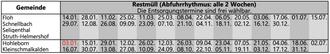 | Restmüll: | Für Grundstücke, die nicht mit den Regelfahrzeugen anfahrbar sind, gelten gesonderte Entsorgungstermine. Bitte wenden Sie sich hierzu direkt an den Entsorger. |