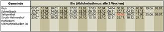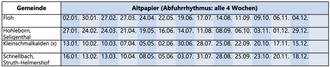 | Papier (x) + Bio (x): | Teilbereiche dieser Orte haben eine Sonderregelung. Das Altpapier ist an den nächst gelegenen Containerstellplatz zu bringen bzw. kann die blaue Tonne sowie die Biotonne am Entsorgungstag an die nächst anfahrbare Straße gestellt werden. Für anfahrbare Grundstücke gelten die angegebenen Entsorgungstermine. |
