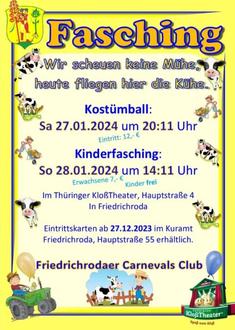 Unter dem Motto „Wir scheuen keine Mühe, heut fliegen hier die Kühe“ finden dieses Jahr zwei Veranstaltungen des FCC e.V. im Kloßtheater Friedrichroda statt. Am 27.01.2024 beginnt um 20:11 Uhr der Kostümball mit einer abwechslungsreichen Show und anschließender Faschingsparty mit DJ Dog. Am Sonntag, 28.01.2024 startet der Kinderfasching um 14:11 Uhr und hält neben Spiel und Spaß einige Überraschungen bereit.