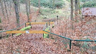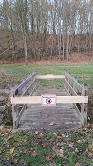 Im Ortsteil Ernstroda ist die hölzerne Brücke am „Schweizer Hof“ bis voraussichtlich Frühjahr 2026 gesperrt. Hiervon ist der ehemalige Thüringen-Weg zwischen Ernstroda und dem Dachsberg betroffen, gekennzeichnet durch blauen Punkt bzw. gelben Strich.