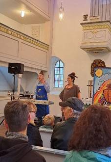 Im Anschluss an den gemütlichen Nachmittag und als besonderer Höhepunkt des Festes fand das vom Träger organisierte eintrittsfreie Familienkonzert und Mitmachtheater in der Kirche Ernstroda statt. Gabi und Amadeus Eigner waren extra aus Chemnitz angereist und begeisterten mit dem Singspiel „Käpt`n Noah und die fast vergessenen Holzwürmer“ nicht nur die Kleinen.