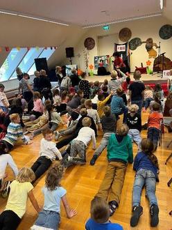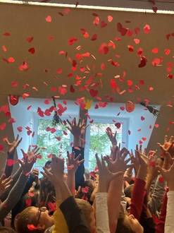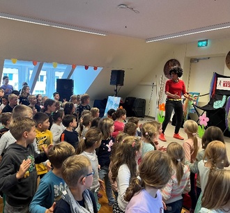 Am 17. September fand für unsere Hortkinder ein vorgezogenes Kindertagsfest statt. Alle Klassen versammelten sich nach der Vesperzeit in der Aula. Nach einer kurzen Begrüßung durch unsere Hortkoordinatorin Frau Wagner ging es auch schon direkt los. KESS, eine junge Frau aus Leipzig, startete ihr Mitmachprogramm mit lauter Musik und einer Seifenblasenkanone. Sofort sprangen alle Kinder in die Höhe und versuchten freudig, die Seifenblasen zu fangen. Während des gesamten Programms waren die Kinder kaum auf ihren Plätzen zu halten. Aktiv wurden sie von KESS mit einbezogen. So gab es neben einem Monster- und Piratentanz für alle auch Mitmachaktionen direkt auf der Bühne. So bekamen u.a. einige Viertklässler die Aufgabe, aus Zollstöcken die Anfangsbuchstaben unserer Schule zu formen. Gar nicht so einfach - aber trotzdem geschafft! Ein weiteres Highlight war eine Schneeballschlacht mit kleinen, weißen Plastebällen. Was für eine Freude. Zum Schluss wurde das Programm mit einer Konfettikanone beendet, die nach einem Countdown rote Herzen durch die Aula fliegen ließ. Bevor alle Kinder in ihre Gruppenräume zurückkehrten, holten sie sich noch ein Autogramm bei KESS.