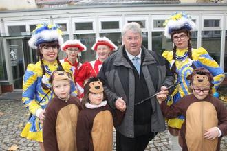 Die Sternchen, Funken- und Prinzengarde des FCC e.V. Friedrichrod begleiten unseren Bürgermeister Thomas Klöppel zur symbolischen Schlüsselübergabe.
