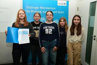 Am Donnerstag, dem 24.Oktober 2024, fuhren wir nach Erfurt ins Bildungsministerium, um dort unseren Preis entgegenzunehmen. Wir waren natürlich total aufgeregt und haben uns gefreut, dass wir die Jury mit unserer Herbstausgabe „Inklusion: Alles, was zählt, sind wir” überzeugen konnten.