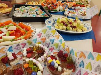 Endlich war es soweit! Unser Schlemmernachmittag konnte wieder einmal stattfinden. Am 30.01.24 durften die Hortkinder unserer Grundschule ganz nach ihrem Geschmack schlemmen. Im Vorfeld konnten sich die Kinder für eine Station entscheiden, an denen die leckeren Kleinigkeiten vorbereitet wurden. Zur Auswahl standen zum Beispiel Sandwiches belegen, Reiswaffeln verzieren, Obst und Gemüseplatten garnieren, Quark und Joghurt zubereiten, Käsespieße stecken und Muffins backen. Eine Gruppe kümmerte sich auch um die Gestaltung des Buffets, auf dem unsere ganzen Köstlichkeiten dann zusammen einen Platz fanden.