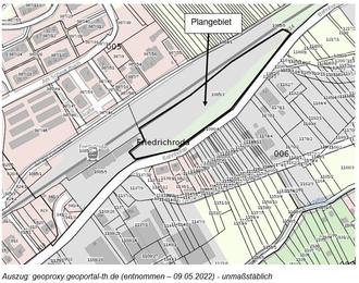 | 6. | Der Geltungsbereich des Vorhabenbezogenen Bebauungsplanes umfasst teilweise die Flurstücke 1085/3 und 1085/5 der Flur 5 der Gemarkung Friedrichroda und besitzt eine Größe von ca. 1,3 ha. |