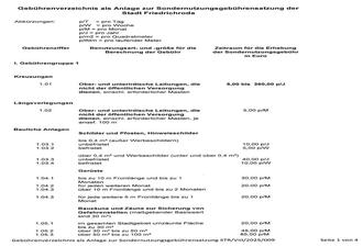 (1) Für erlaubnispflichtige Sondernutzungen an den öffentlichen Straßen im Sinne von § 1 der Satzung über Sondernutzungen an öffentlichen Straßen im Gebiet der Stadt Friedrichroda werden Gebühren nach Maßgabe des in der Anlage beigefügten Gebührenverzeichnisses erhoben, das Bestandteil dieser Satzung ist.