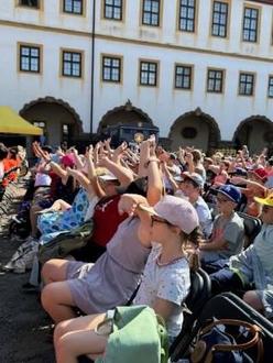 Der nächste Höhepunkt erwartete unsere Dritt- und Viertklässler gleich am darauffolgenden Tag. Am 15. August fuhren wir mit einer Sonderbahn der Waldbahn nach Gotha. Dort konnten wir unser Frühstückspicknick im idyllischen Park genießen. Danach erlebten unsere Schüler ein beeindruckendes Konzert im Schloss Friedenstein. Das Ambiente beeindruckte die Kinder sehr, aber noch mehr faszinierte sie die Philharmonie Gotha- Eisenach sowie der Sänger Thomas Hahn & Band und ganz besonders der große Kinderchor. Lange hielt es uns nicht auf den Stühlen, da wir alle so von der Musik mitgerissen wurden. Plötzlich wurden die Hüften und das Tanzbein geschwungen und nicht nur der Kinderchor auf der Bühne verstärkte die Sänger, sondern auch unsere Schüler aus dem Publikum, die inbrünstig und aus Leibeskräften die chartbekannten Songs mitsangen.