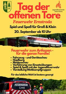 Die Freiwillige Feuerwehr Ernstroda öffnet am Samstag, den 20. September 2025, ab 10.00 Uhr bis voraussichtlich 19 Uhr ihre Tore und lädt Klein und Groß herzlich zum „Tag der offenen Tore“ ein.
