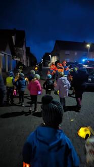 Schließlich war es Zeit für den Höhepunkt des Abends: den Martinsumzug. Die Jugendfeuerwehr und aktiven Kameraden begleiteten den Martinreiter mit Wachsfackeln. Alle anderen Kinder mit Eltern und in Großeltern hielten ihre Lampions hoch und folgten dem Martinreiter durch die Straßen.