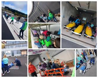 Nach den Mannschaftsportarten am Montag ging es am Dienstag hoch nach Oberhof zur Biathlon Arena und Rennrodelbahn. Dort haben uns Biathlontrainer auf einem Schneeteppich das Skifahren gezeigt, mit Lasergewehren ein wenig schießen auf winzige Scheiben beigebracht und Verantwortliche die Skihalle und das Biathlonstadion inkl. Schießstand gezeigt. Nach der Mittagspause ging es weiter zur Rennrodelbahn. Dort trafen wir mit Alexander Rüdiger und Matthias Höpfner ehemalige Olympiateilnehmer im Bob, welche uns ihr Sportgerät zeigten und probesitzen ließen. Danach durften alle einmal einen Hauch des Windes und der Geschwindigkeit spüren, welche die Bobfahrer kurz nach dem Anschub/Start in der Bobbahn spüren, indem alle einmal von den ehemaligen Olympiateilnehmern auf der Anschubbahn im Trainingsbob angeschoben worden.