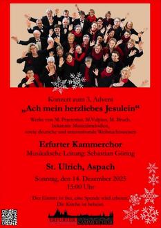 Es ist schon ein Glücksfall, dass der Erfurter Kammerchor zu uns in der Adventszeit nach Aspach kommt. Verpassen Sie deshalb nicht diese Gelegenheit, in Gemeinschaft und festlichem Ambiente sich musikalisch auf das Weihnachtsfest einzustimmen. Nach dem Konzert laden wir zum Kaffee ein.
