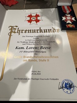 Eine Ehre mit Seltenheitswert wurde einen Kameraden aus unserer Gemeinde zu Teil. Im Rahmen der gemeinsamen und jährlichen Dankeschön-Veranstaltung des Landkreises Gotha und des Kreisfeuerwehrverbandes Gotha wurde der Kamerad Lorenz Beese aus Hörselgau für seine 70-jährige Mitgliedschaft in der Feuerwehr geehrt. Dies ist ein gebührender Rahmen solch verdiente Kameraden zu ehren. Neben den Landrat, zählte auch der neue Kreisbrandinspektor, sowie der Vorsitzende des Kreisfeuerwehrverbandes und ein Vertreter des Thüringer Feuerwehr-Verbandes zu denjenigen, welche die Auszeichnung vornahmen.