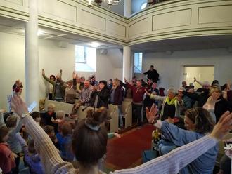 Pusteblumenkinder ließen es sich nicht nehmen und kamen gut gelaunt in die Kirche. Natürlich waren auch die regelmäßigen Besucherinnen vom " Kirchenkaffee " eingeladen.