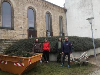 Mit der Ankündigung machten wir uns Gedanken, was Jugendliche verändern können, damit der Einsatz sich positiv im Gedächtnis verankert. Das Umfeld unseres Kinderspielplatzes, der Schulhof und eine Hecke vor der Kirche sollte in Ordnung gebracht werden. Die Wand neben dem Spielplatz war schon seit längerer Zeit ein Ärgernis und Unfallgefahr für Kinder. Unser Senior Norbert Krone hatte dazu einen Plan und mit Unterstützung der Gemeinde wurden benötigte Materialien besorgt und ein Container bereitgestellt.