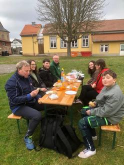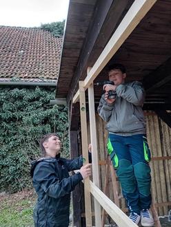 Pünktlich um 8 Uhr standen die Schüler Marlen Graul, Tobias Köllner, Marie Graul, Felix Kirchheim und Paul Rudloff mit dem Lehrer Herrn Peter Bake auf dem Schulhof. Nachdem wir uns kurz bekannt machten, die Aufgaben erläuterten, ging es an die Arbeit. Unter der Leitung von Norbert arbeitete eine Gruppe an der Wandkonstruktion und die andere unter Leitung des Herrn Bake an der Heckenpflege und Aufräumarbeiten auf dem Schulhof. Den Dorfkindern konnte man sofort einen sicheren Umgang mit dem Werkzeug und Arbeitsinstrumenten bescheinigen.
