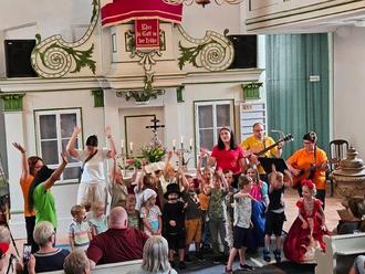 Der nächste Höhepunkt ließ nicht auf sich warten. Da der Geburtstag unseres Kindergartens buchstäblich ins Wasser fiel, führten die Kinder ihr Programm nun in der Kirche auf. So viel Vorbereitung und Arbeit durfte doch nicht umsonst sein. Wieder füllten viele Besucher die Kirchenbänke. Ein bunt gemischtes Programm verkürzte den Nachmittag.