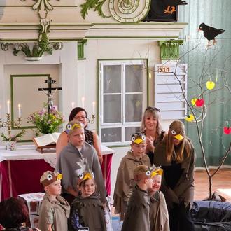Pünktlich um 14.00 Uhr begann dieser schöne Tag mit einer Andacht von Pastorin Schaller. Die kleinen Spatzen in der ersten Reihe, warteten schon ungeduldig auf ihren Auftritt. Das Singspiel " Der ängstliche kleine Spatz "haben die Kinder schon lange eingeübt. Natürlich herrschte große Aufregung, denn ein Team vom MDR Thüringen Journal hat uns besucht. Unbeeindruckt haben die Kinder gespielt, wie die Profis. Mit viel Applaus wurden sie dafür belohnt.