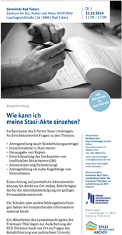Das Bundesarchiv -Stasi Unterlagen- Archiv Erfurt bietet am Dienstag, 22. Oktober 2024 im Zentrum für Kur, Kultur, und Natur „KUKUNA“ der Gemeinde Bad Tabarz allen Interessierten die Möglichkeit, sich rund um das Thema Akteneinsicht beraten zu lassen und einen Antrag zu stellen.