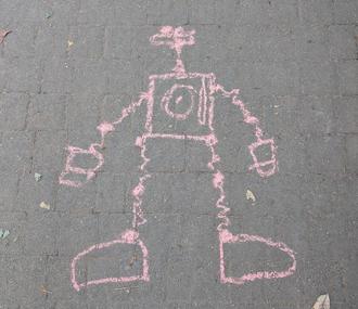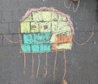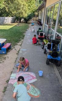 Bei den sommerlichen Temperaturen verschönern die Pfiffikusse den Plattenweg um den Kindergarten.