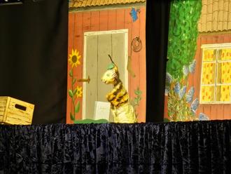Dort angekommen durften wir uns in der Gemeinde umschauen. Bürgermeister Herr Meusel präsentierte uns den großen Sitzungssaal und sein Büro. Anschließend gingen wir gemeinsam in den Kultursaal und staunten, denn es stand dort eine Bühne mit rotem Vorhang und Stühle, es sah aus wie in einem richtigen Theater. Als alle Kinder ihren Platz eingenommen hatten, begann die Vorstellung.