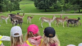 …lacht die Sonne! Genauso war es an unserer Kindertags Fahrt am 28. Mai. Der Wettergott meinte es gut mit uns. Pünktlich um 7.30 Uhr stiegen alle kleinen & großen Ausflügler aufgeregt und erwartungsvoll in den Bus. Das Ziel unseres Ausflugs war der Wildpark in Tambach. Schon allein die Busfahrt stellte ein Highlight dar, besonders für unsere Jüngsten, die sicherlich zum ersten Mal in einem solchen Fahrzeug saßen. In Tambach gut angekommen, stärkten sich alle Kinder erst einmal mit leckeren Frühstücksbroten, Obst, Gemüse und Getränken. Nun konnten wir bestens gerüstet starten und den schönen Park mit seinen Bewohnern zu erkunden. Die älteren Schnatterschnäbel nahmen an einer Führung teil und erfuhren so, sehr viel Wissenswertes über die jeweiligen Tiere.