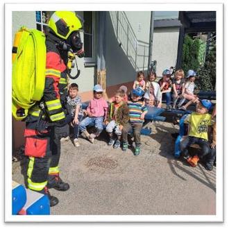Ganz eng mit dem Thema Feuer ist natürlich auch das Thema Feuerbekämpfung verbunden. Wir haben uns intensiver mit der Feuerwehr auseinandergesetzt. Seit wann gibt es die Feuerwehr? Was macht die Feuerwehr? Wer kann zur Feuerwehr? Das sind nur ein paar Fragen, die wir in diesem Zusammenhang geklärt haben. Die Elfen lernten auch die Legende vom Heiligen Florian kennen, dem Schutzpatron der Feuerwehr. Natürlich fanden auch hierzu in allen Bereichen kleine Lernangebote statt, und das Ganze wurde mit einem Besuch der Feuerwehr in der Kita gekrönt, bei dem wir die Ausrüstung kennenlernen konnten, etwas über das Verhalten im Brandfall lernten und auch selber am Schlauch tätig werden durften.