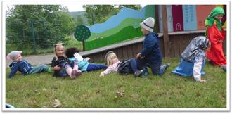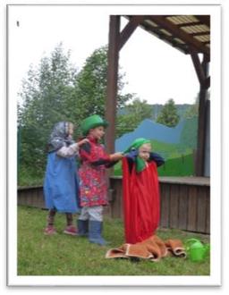 Doch das Beste kam jetzt: wer Lust und Laune hatte, durfte nun selbst zum Schauspieler werden und in eine Rolle seiner Wahl schlüpfen. Die Begeisterung war groß und das Angebot wurde reichlich genutzt, sich als „Großvater“, „Mäuschen“ oder „Enkelchen“ zu verkleiden. Es war eine schöne Erfahrung für die Kinder, einmal in eine andere Rolle zu schlüpfen und sich vor Zuschauern zu präsentieren.