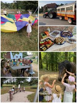 Danach wurde den beiden Pferden auf der Weide und den Hühnern, Enten und dem Hofhund noch ein Besuch abgestattet, bevor es zu Fuß nach Oerlsdorf ging. Schließlich war der Tag noch lange nicht zu Ende. Auf dem Spielplatz in Oerlsdorf angekommen, warteten bereits noch andere Überraschungen auf die Kinder. Es konnte geklettert und geschaukelt werden. Es wurden verschiedene Spiele mit dem Schwungtuch gespielt und auch beim Balancieren und Ballspielen hatten die Kinder großen Spaß.