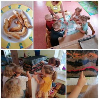 Als die Erde eingefüllt war, suchten die Kinder fleißig Regenwürmer, welche ins Regenwurmglas gesetzt wurden. Nun können die Zwerge jeden Tag die Regenwürmer bei ihrer Arbeit beobachten. Durch die unterschiedlichen Erdschichten lässt sich genau erkennen, wo die Würmer die Erde bereits umgegraben haben. Und damit sich die Würmchen auch wohl fühlen (Regenwürmer mögen es dunkel und feucht), malten die Kinder fleißig Regenwurmbilder, welche das Regenwurmglas abdunkeln. Zum Beobachten muss man diese nur ganz einfach hochklappen. Auch wird regelmäßig die Erde feucht gehalten und es gibt welke Blätter als Nahrung für die Würmer. Neben vielen verschiedenen Liedern und Fingerspielen über Regenwürmer, haben die Zwerge auch leckere Regenwurmkekse gebacken. Lecker!