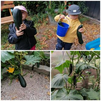Die Gurken und Zucchini wachsen so üppig, dass es fast jeden Tag Früchte zu ernten gibt. Aber auch Kräuter, für die Zubereitung von Tee oder Kräuterquark und Schnittlauchbrote, wachsen im Naschgarten der Kinder.