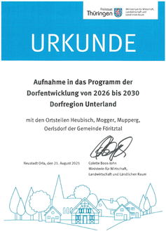 WIR HABEN ES GESCHAFFT! Nach der Erarbeitung des gemeindlichen Entwicklungskonzeptes zusammen mit dem Dorfentwicklungsbeirat im Jahr 2024 wurde dieses erfolgreich bewertet. Die Gemeinde Föritztal erhielt am 21.08.2025 die Urkunde für die Anerkennung als Förderschwerpunkt von 2026 bis 2030 für die Dorfregion „Unterland“ mit den Ortsteilen Heubisch, Mogger, Mupperg und Oerlsdorf.