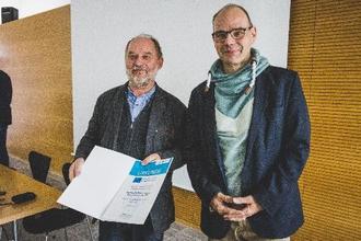 Torsten Weil, Staatssekretär im Ministerium für Infrastruktur und Landwirtschaft, übergibt Rainer Zobel, Vereinsvorsitzender der RAG Gotha-Ilm-Kreis-Erfurt die Urkunde.