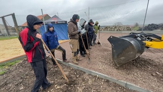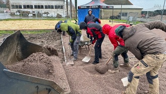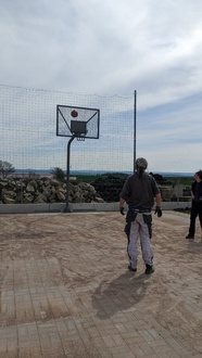 Trotz bescheidenen Wetters war die reifere Dorfjugend Ende April nicht davon abzuhalten, den Basketballplatz der „Bienstädt Arena“ weiter auszubauen. Auch unser Bürgermeister ging bei dieser Aktion auf die Knie und legte beim Pflastern fachkundig mit Hand an.