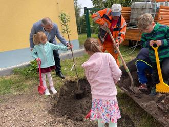 Zum 30-jährigen Jubiläum der VG „Nesseaue“ im letzten Jahr fand eine Baumpflanzung unter dem Motto „Naturdenkmäler von morgen pflanzen - für eine klimagesunde Zukunft an der Nesseaue“ statt. Wie damals versprochen, wurde nun am 02.06.2023 diese Aktion nun auch in unserem Kindergarten mit einer alten Apfelsorte, „Kirchweih-Apfel“, fortgesetzt.